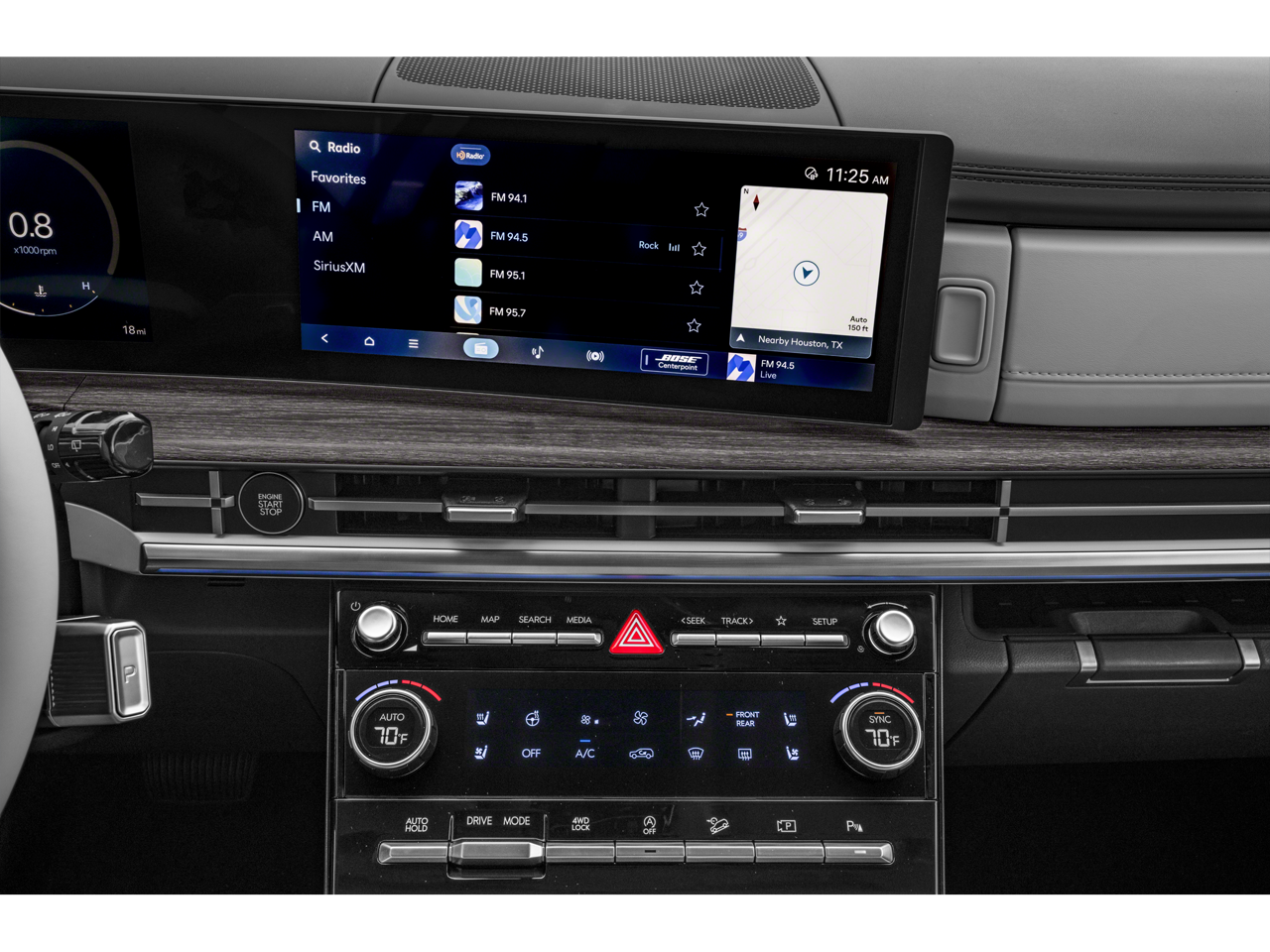 - Radio: AM/FM/HD Bose Premium Audio System -inc: 12 speakers including subwoofer, external amplifier, 12.3" wide touchscreen, Apple CarPlay and Android Auto, Bluetooth® hands-free w/wireless audio streaming, dynamic voice recognition, USB connectivity, SiriusXM, Blue Link+ connected car system, over-the-air updating capability, navigation system including traffic flow w/incident data via HD Radio (HERE) and rear seat quiet mode