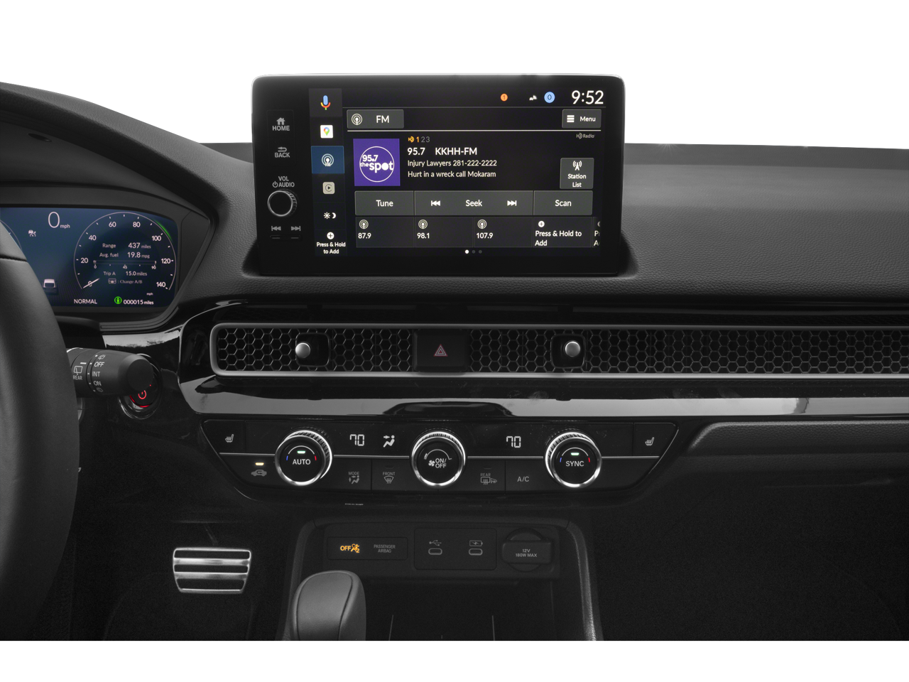 - Radio: Bose Premium Sound System -inc: 12 speakers w/subwoofer, 9" color touchscreen, Google built-in (includes 3-years unlimited data plan for in-vehicle apps), Alexa built-in, Bluetooth® HandsFreeLink and streaming audio, HondaLink, Speed-Sensitive Volume Compensation (SVC), Radio Data System (RDS), wireless Apple CarPlay and Android Auto compatibility, Wi-Fi hotspot capability, 2 USB-C 3.0A smartphone/audio interface and HD Radio